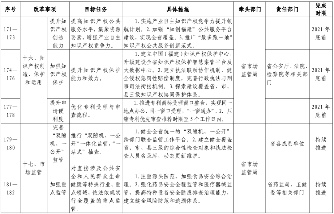 4.针对加强市场主体权益保护,提出:实施产业自主知识产权竞争力提升领航计划。建立知识产权保护中心,升级建设全省知识产权保护智慧案管平台及大数据中心。开展民事诉讼程序繁简分流改革试点。简易破产案件平均审理周期控制在180天内。