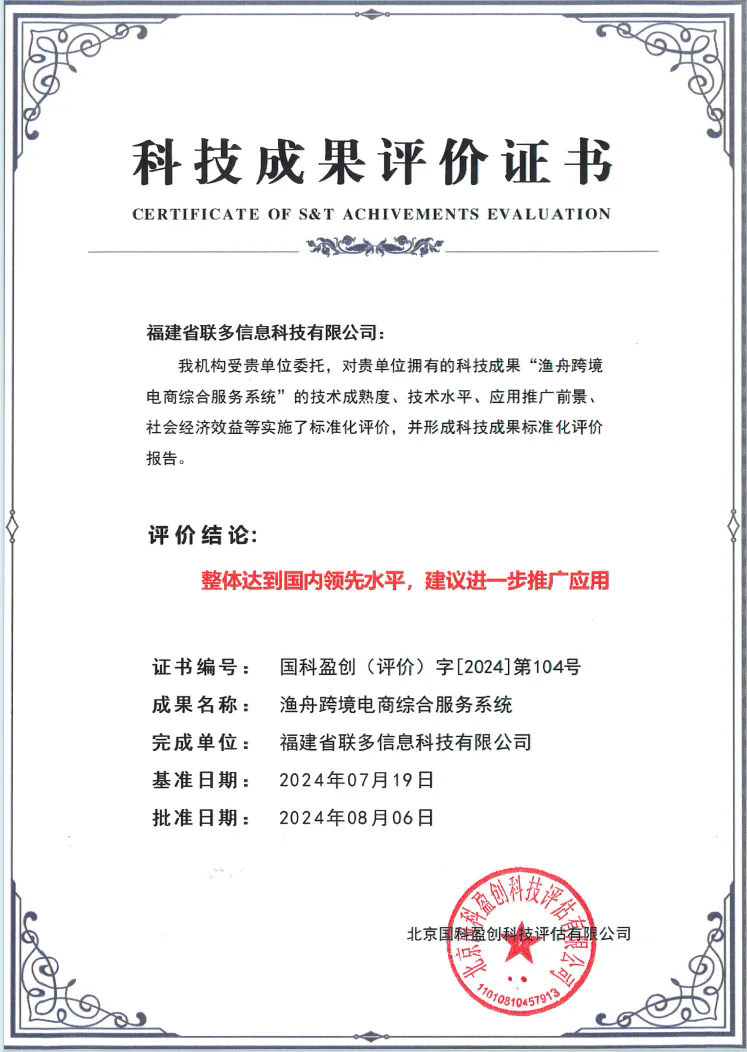 2021年,随着9610通关ERP系统不断的迭代和升级,发展成为一个更加强大的“渔舟”跨综服平台。如今,公司为客户构建了9610、9710、9810三大模式管理下的内控、通关、物流、财税从无到有的完整体系,提供“专业操作+数字化信息系统”的保姆式跨境合规服务,确保企业在跨境业务中合规、高效、稳定发展。这一系列创新不仅极大地提高了跨境电商出口的效率和便捷性,还为企业提供了全方位的贸易链条、资金链条、财务链条规划服务。并且“渔舟”系统在2024年荣获“科技成果评价证书”,填补了福建省内跨境电商服务领域的多项空白,为行业树立了新的标杆。